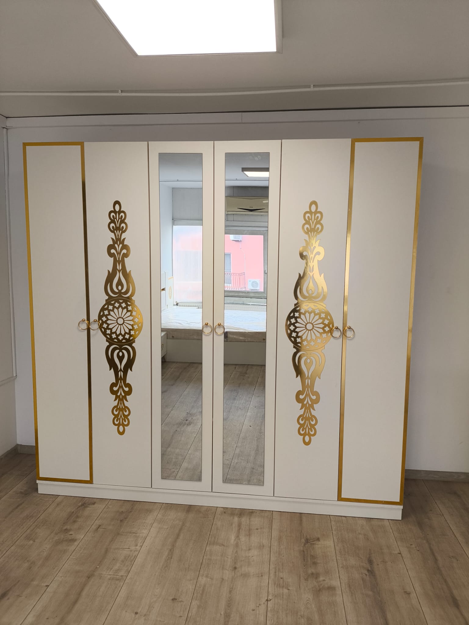 Șifonier generos cu oglindă centrală și compartimentare eficientă pentru haine și accesorii.