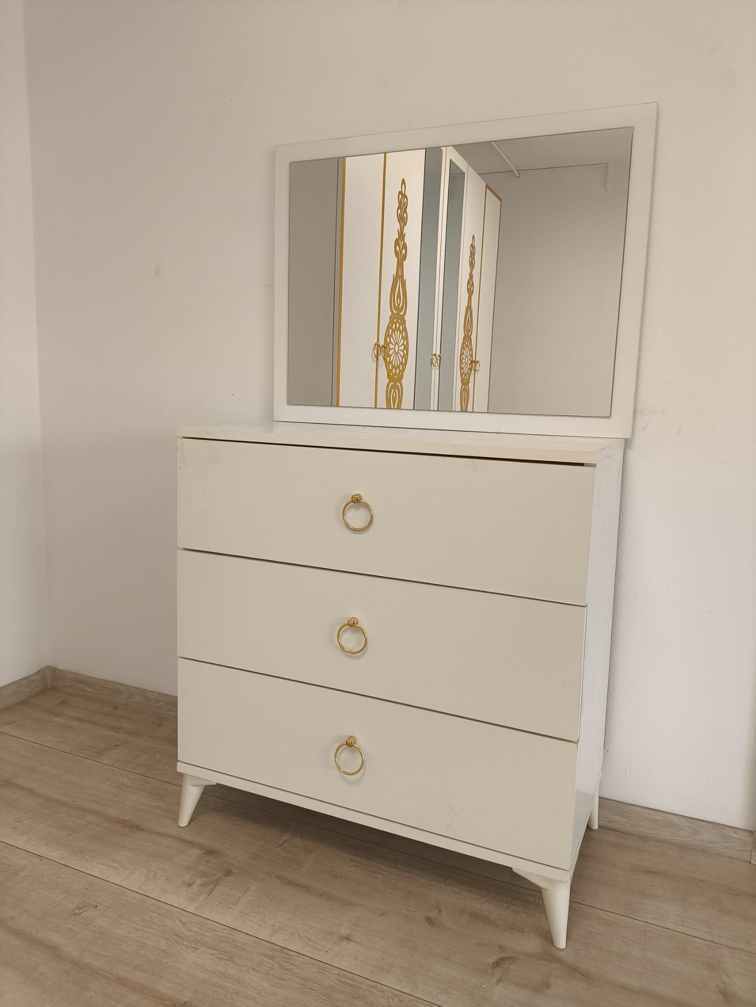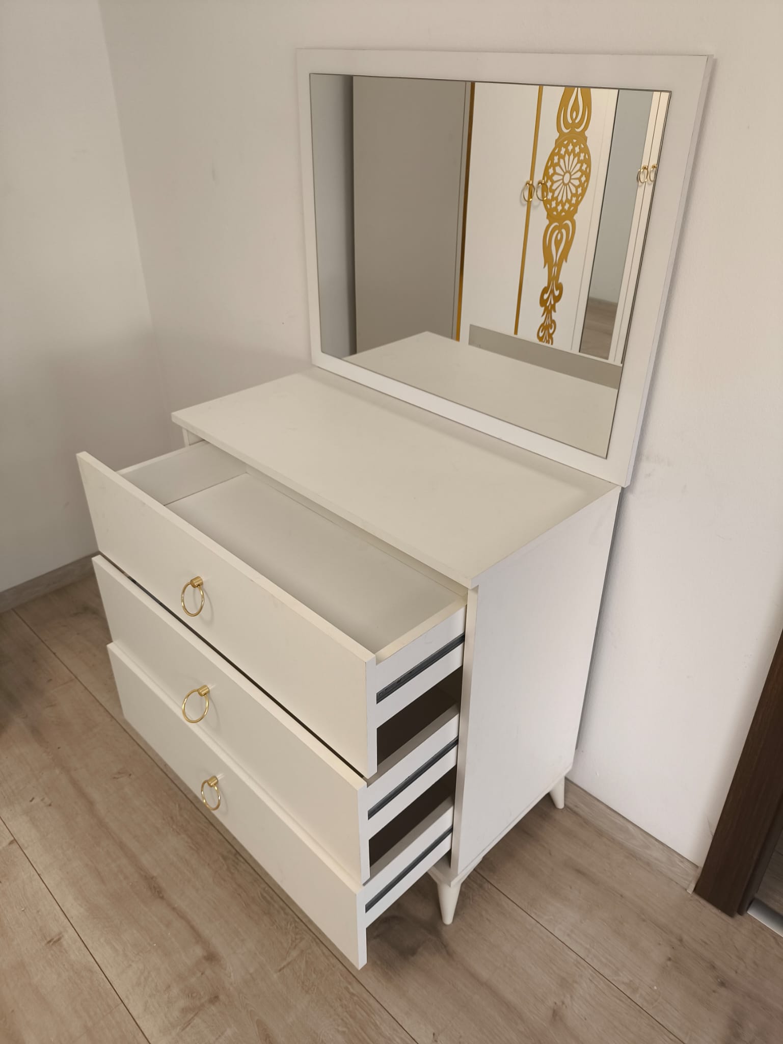 Comodă cu oglindă elegantă, perfectă pentru organizare și machiaj.