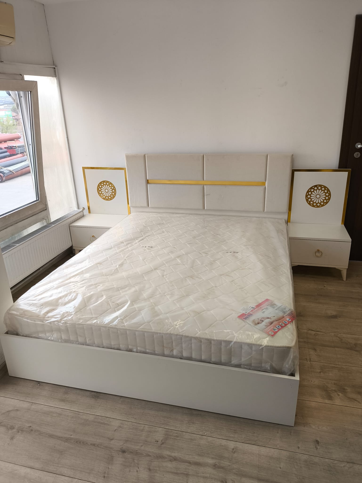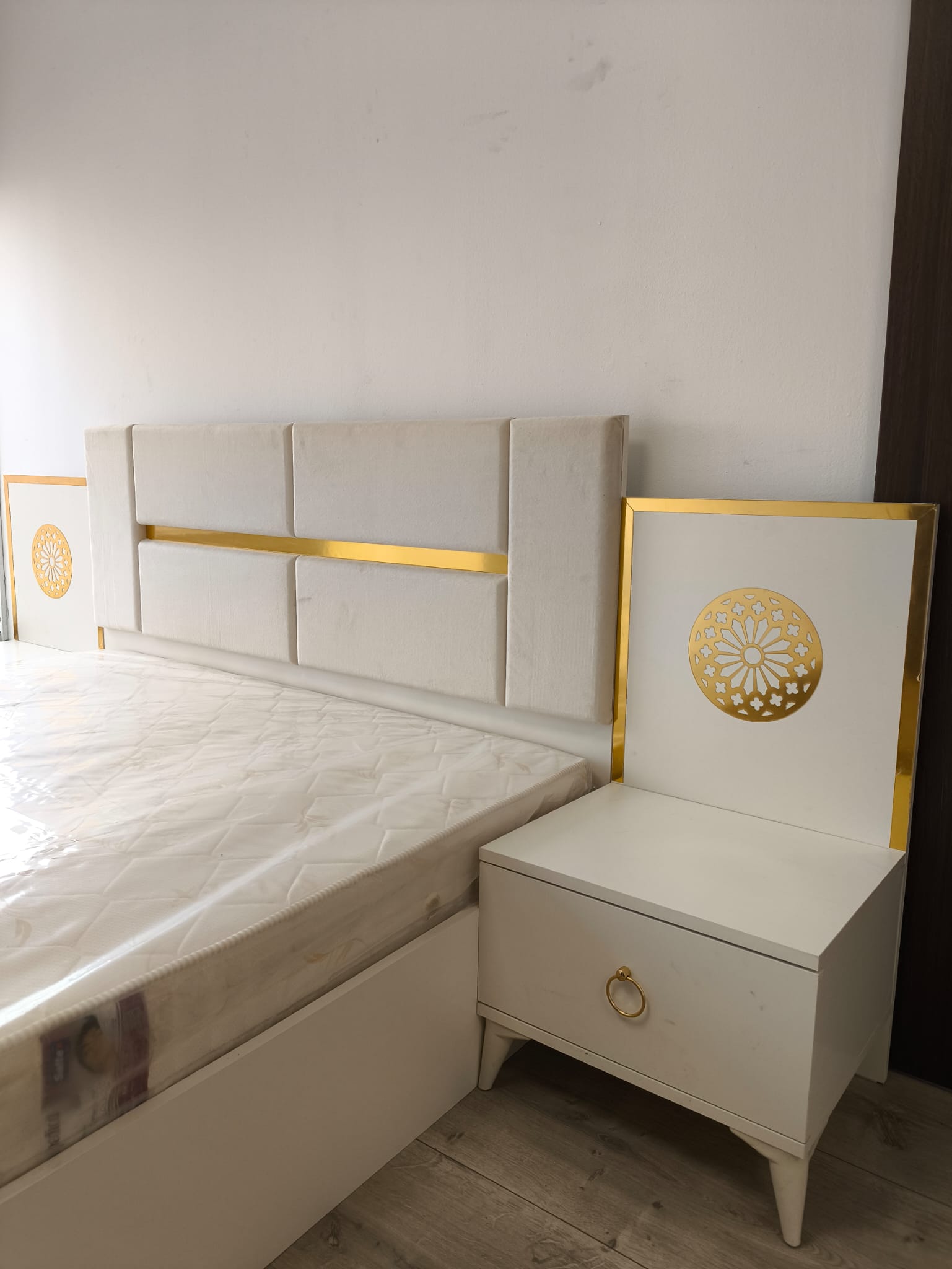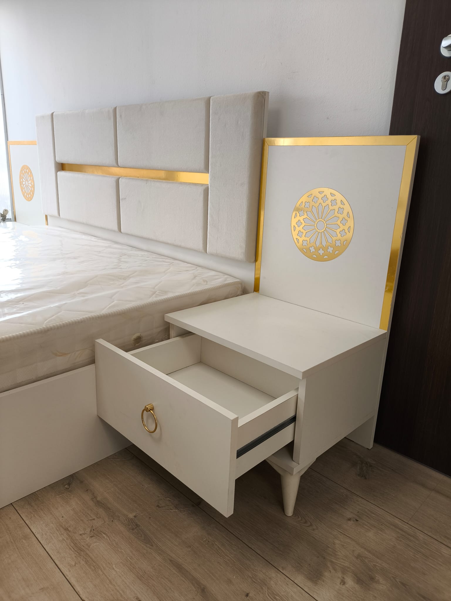 Noptiere laterale incluse, cu spațiu de depozitare practic și detalii aurii rafinate.