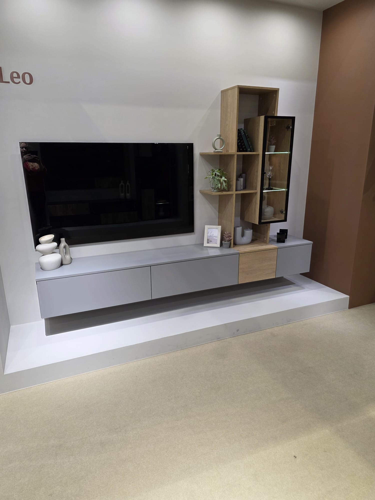 Ansamblul de living Leo este conceput pentru a oferi un echilibru perfect între estetică modernă și utilitate zilnică. Combinația dintre fronturile în nuanță gri mat și elementele cu finisaj lemn natur creează un contrast elegant, potrivit pentru amenajări actuale și spații bine organizate.