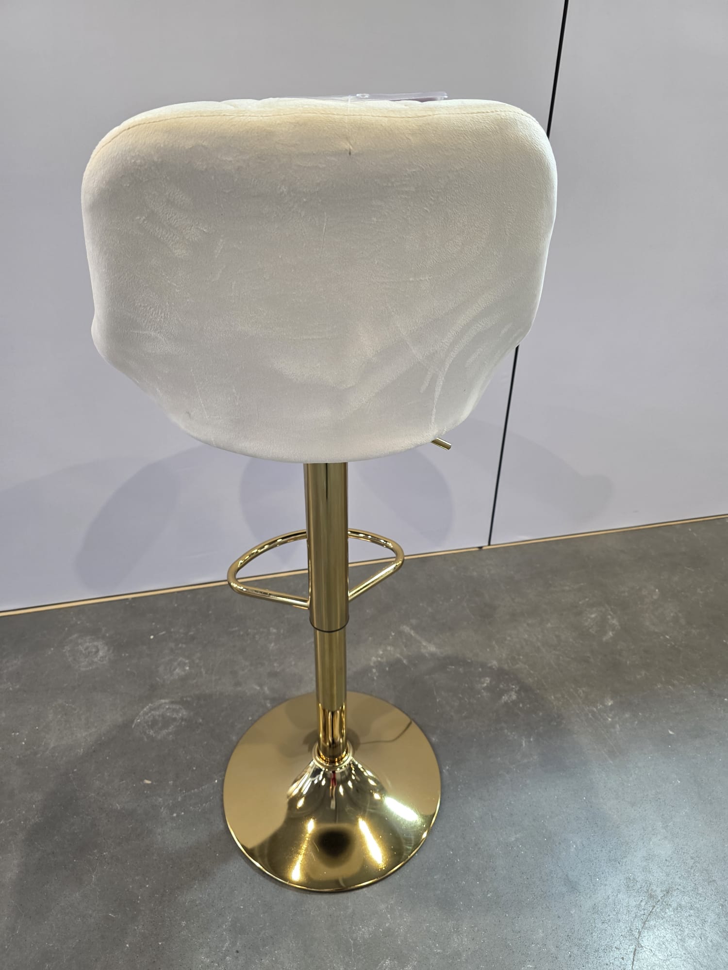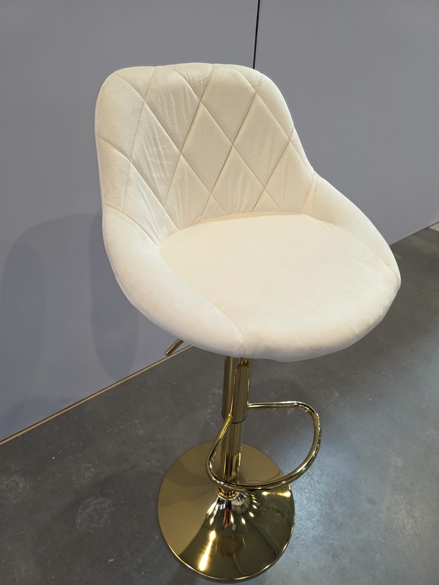 Scaun de bar modern și elegant, cu tapițerie moale de culoare crem și spătar decorat cu model romb (diamond stitching). Designul ergonomic oferă confort sporit, iar baza metalică aurie cu înălțime reglabilă adaugă stabilitate și un aspect rafinat. Este ideal pentru bucătării moderne, insule de bar, livinguri sau spații comerciale precum baruri și cafenele.