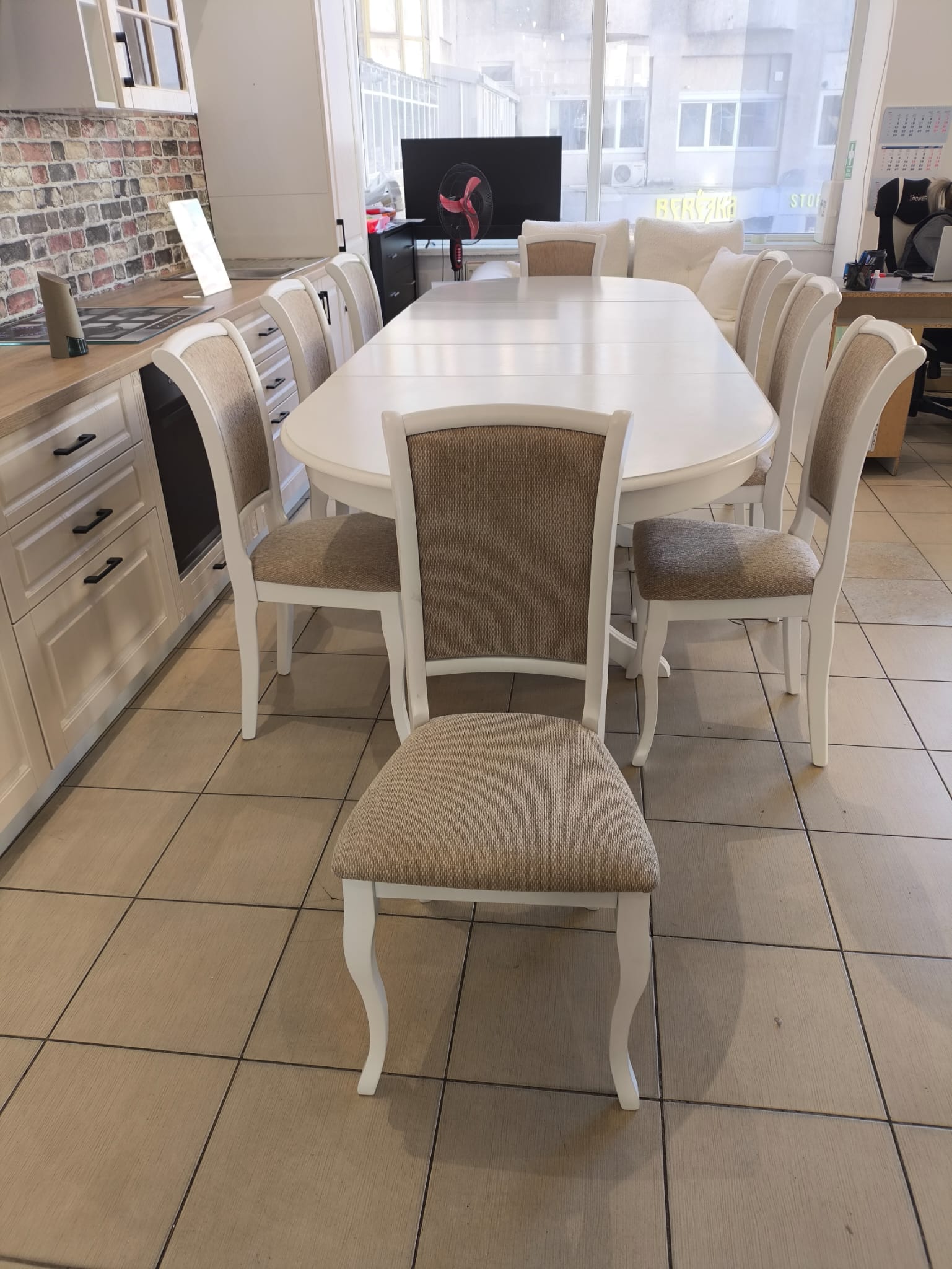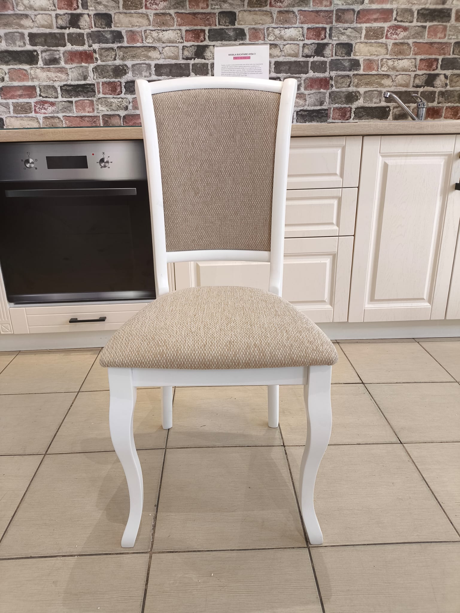 Este un scaun cu aspect clasic realizat pe structura de lemn vopsit, sezut si spatar tapitat cu stofa.