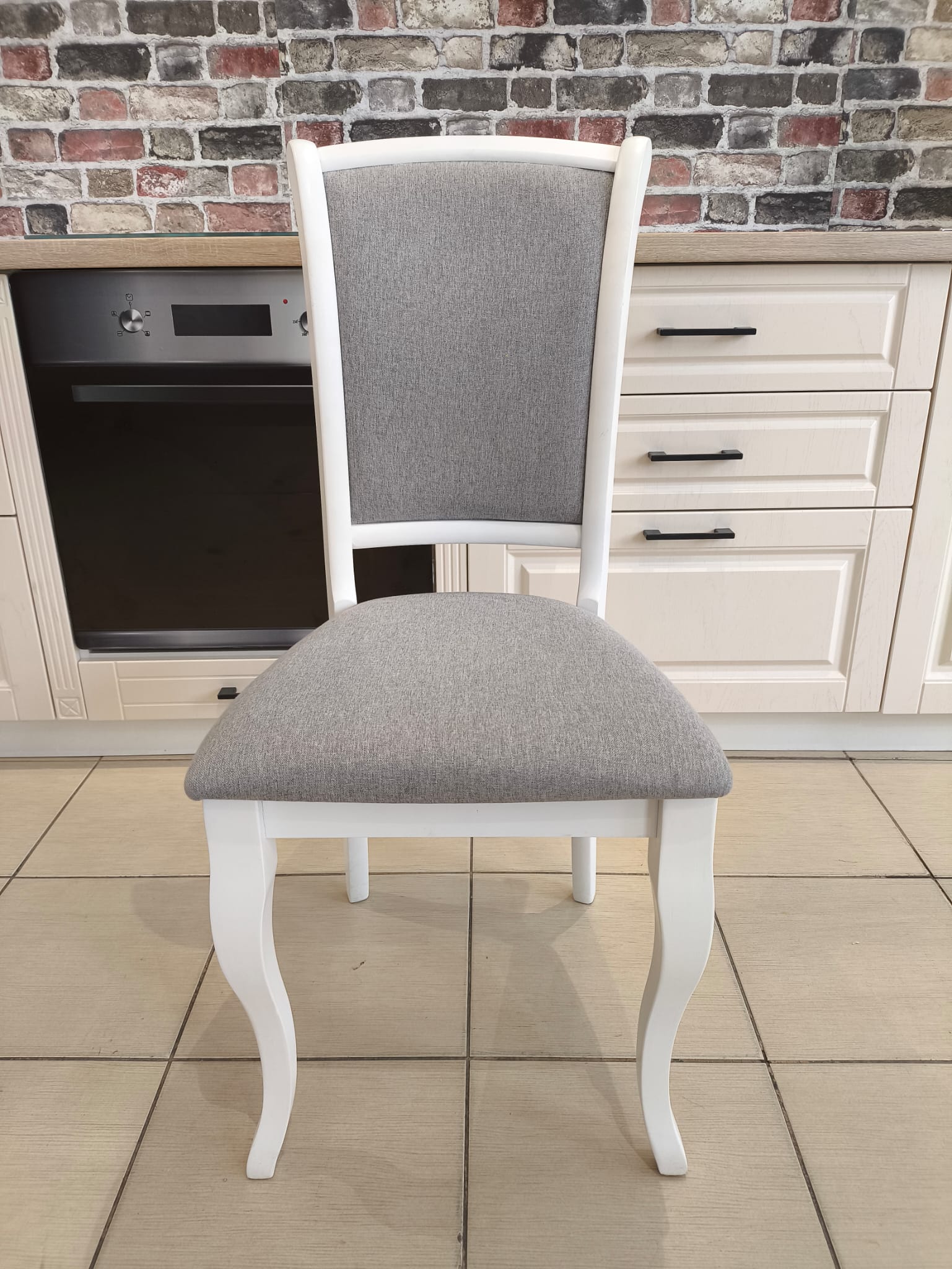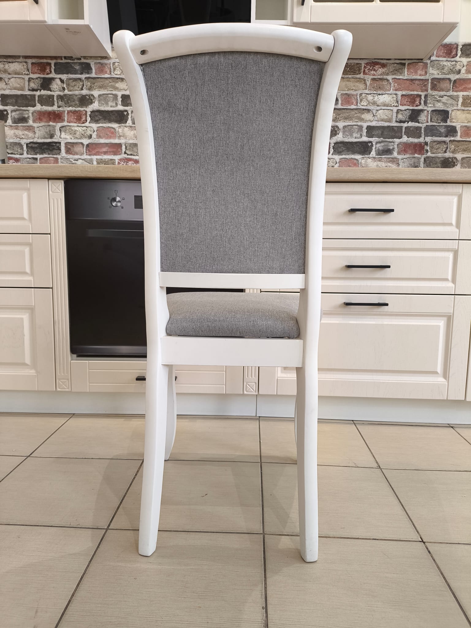Este un scaun cu aspect clasic realizat pe structura de lemn vopsit, sezut si spatar tapitat cu stofa.